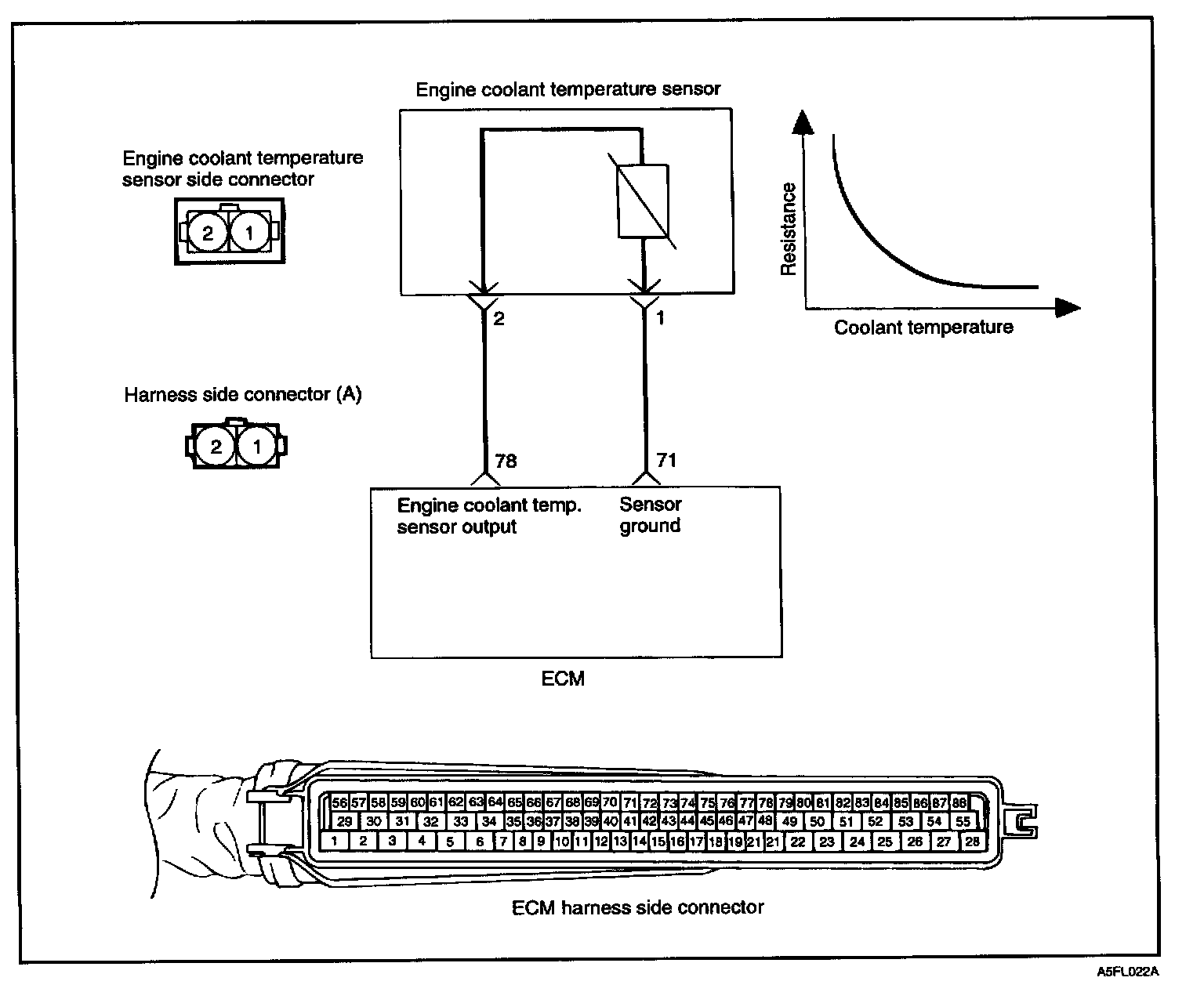 The engine coolant temperature sensor is installed in the engine coolant passage of the cylinder head, detects engine coolant temperature and emits signals to the ECM. This part employs a Thermistor which is sensitive to changes in temperature. The electric resistance of a thermistor decreases in response to temperature rise. The ECM judges engine coolant temperature by the sensor output voltage and provides optimum fuel enrichment when the engine is cold.