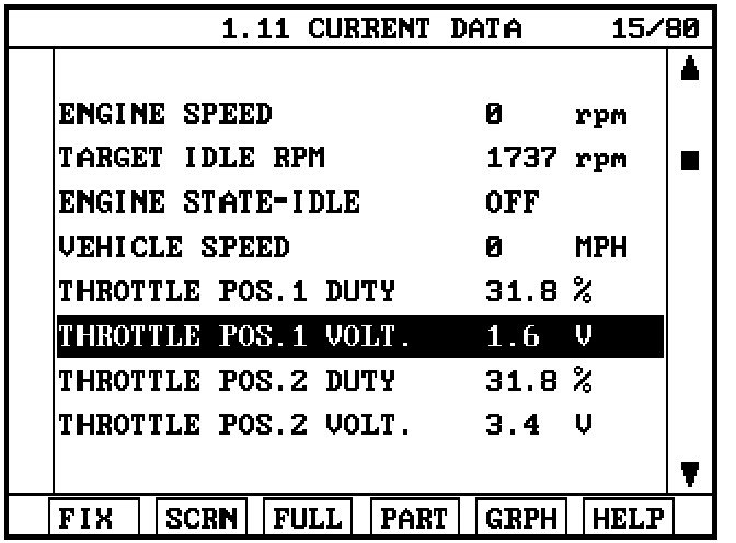 3. Attach a Hi-Scan Pro or GDS and select "Engine" menu, "Current Data" menu and throttle position sensor in volts ("THROTTLE POS. SENSOR" "ACCEL. POS. S". or "ACCEL PEDAL 1 VOLT", depending on model).
