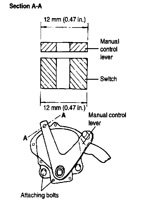 4. Turn the transaxle range switch body until the 12 mm (0.47 inch) wide end of the manual control I ever aligns with the manual control lever aligns with the switch body flange [12 mm (0.472 inch) wide portion].