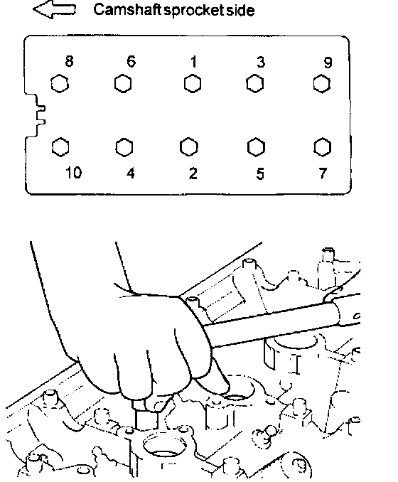 Using sequence shown in the illustration and wrench tool No. 09221-32001 or 09221-11000, or equivalents, tighten cylinder head bolts as follows: