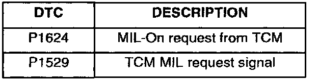 If transaxle DTC are set and the MIL is illuminated, codes P1624 and P1529 will be displayed in the "Engine" menu. The purpose of the DTC is to advise that the TCM requested the ECM to turn on the MIL (the TCM does not have the authority to turn on the MIL).