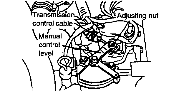 6. Gently pull the transmission control cable in the direction of the arrow, and then tighten the adjusting nut.