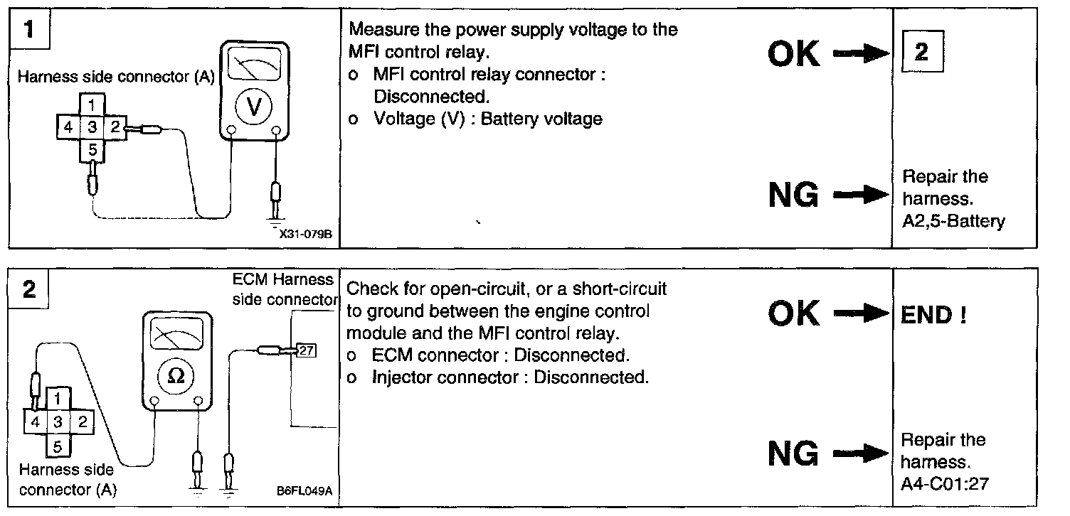 1. Check continuity of relay contacts between terminal 4 (-) and 2 (+).