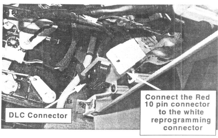 When you reach under the instrument panel, above driver's right foot, the white reprogramming connector is to the left of the DLC connector.
