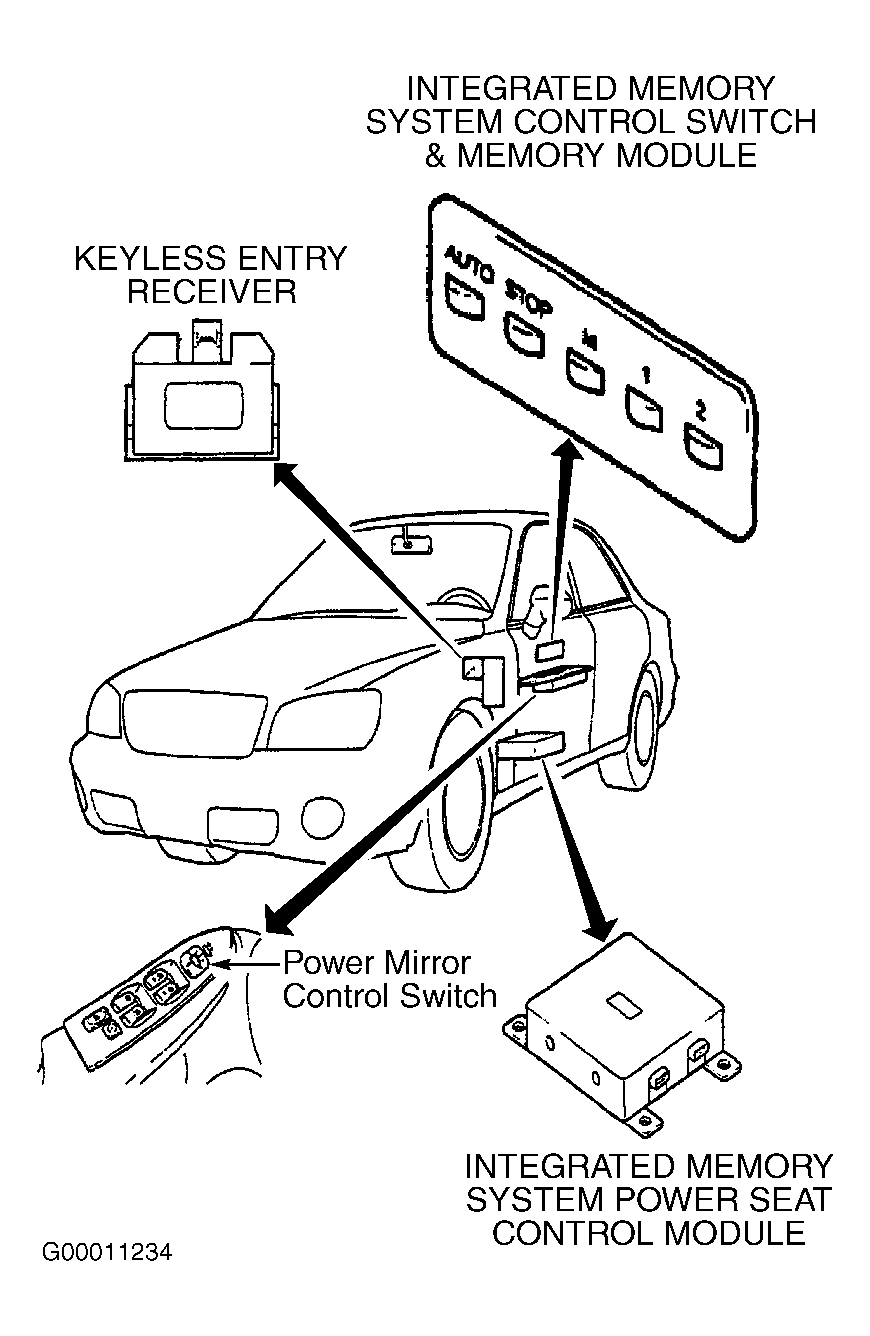 The Integrated Memory System (IMS) control module controls the operation of the driver's power seat and power outside mirrors. The IMS switch has a STOP button and 4 function buttons: AUTO, "M", "1" and "2". See Figure . When the ignition switch is ON and the IMS switch button "1" or "2" is pressed, the driver's seat and outside mirrors will be adjusted automatically to the memorized position. When the AUTO button is pressed, the driver's seat will move backward and forward so driver can get in or out more easily. Driver's power seat and power outside mirrors can be controlled independently by using appropriate manual switch.