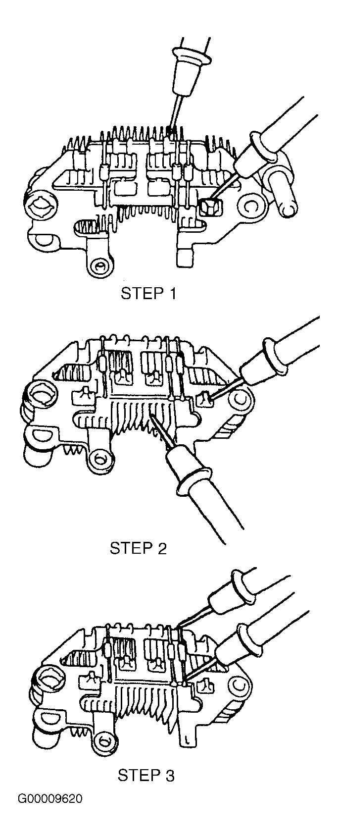 Using ohmmeter, check continuity of each diode, in both directions. See STEP 3 in illustration. See Fig 1 . Continuity should exist in only one direction. If continuity of any diode is not as specified, replace rectifier assembly.
