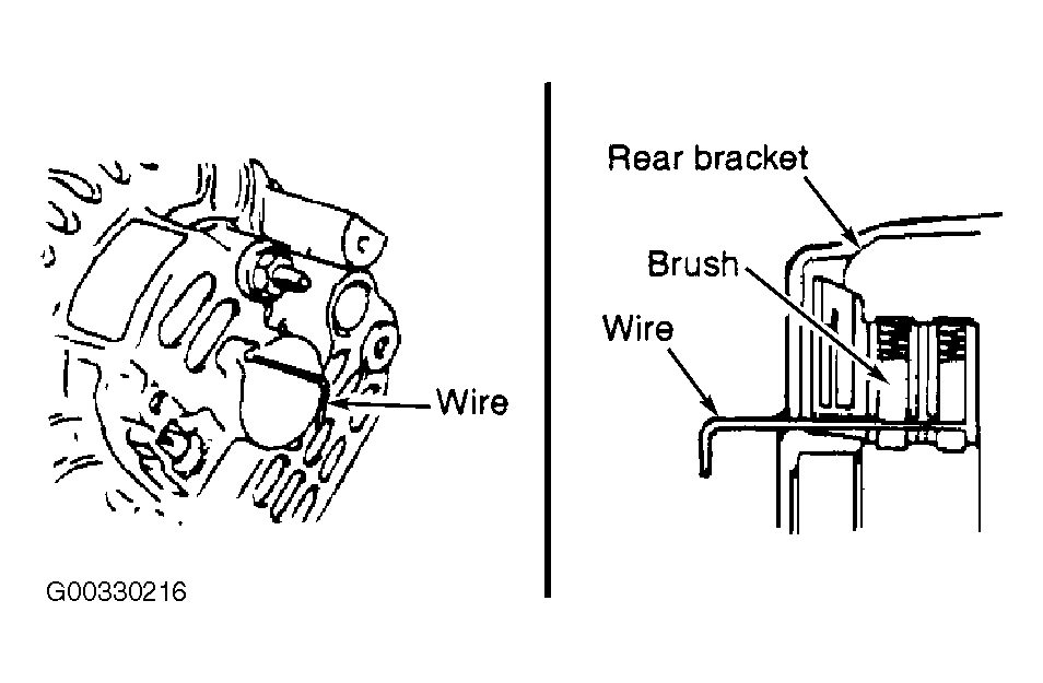 - Before the rotor is attached to the rear bracket, insert a wire through the small hole in the rear bracket to lock the brushes into place. See Fig 1 . After the rotor has been installed, wire can be removed.