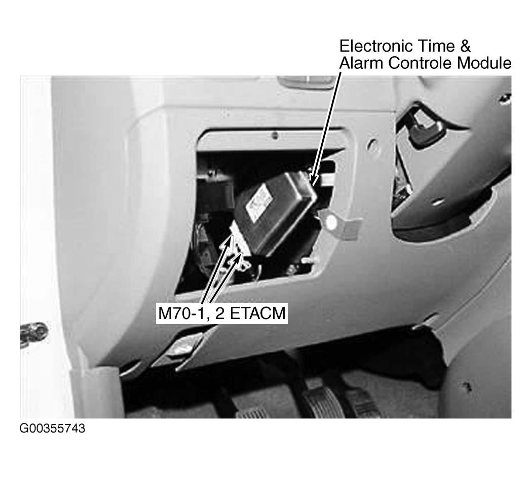 | Electronic Time & Alarm Control Module (ETACM) | Behind Instrument Panel Trim, Left Of Steering Column. See Fig 2 . |