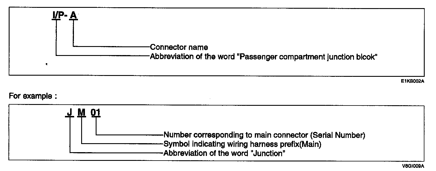 A junction block identification symbol consists of a wiring harness location classification symbol corresponding to a wiring harness location and number corresponding to the connector in the junction block.