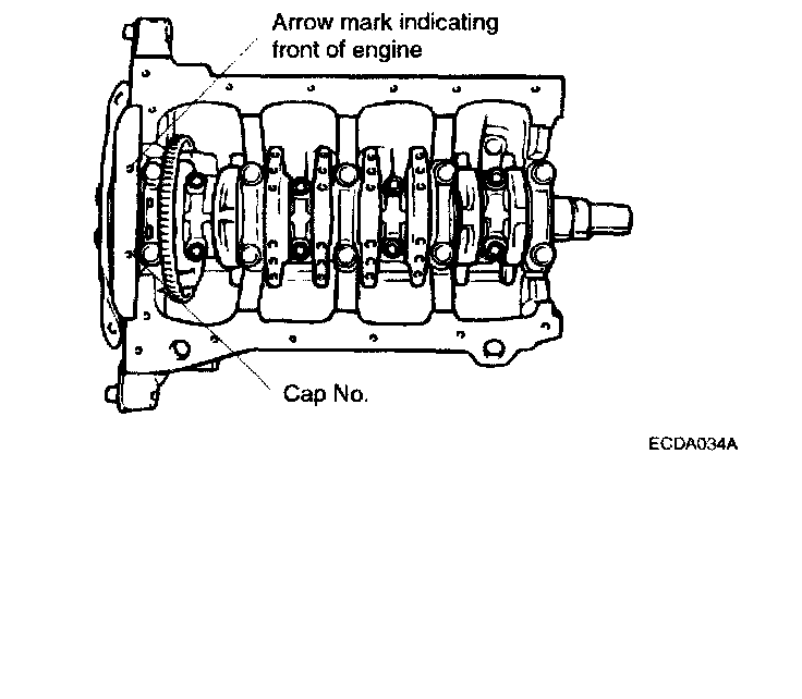 * The caps should be installed with the arrow mark directed toward the crank pulley side of engine. Cap numbers must be correct.