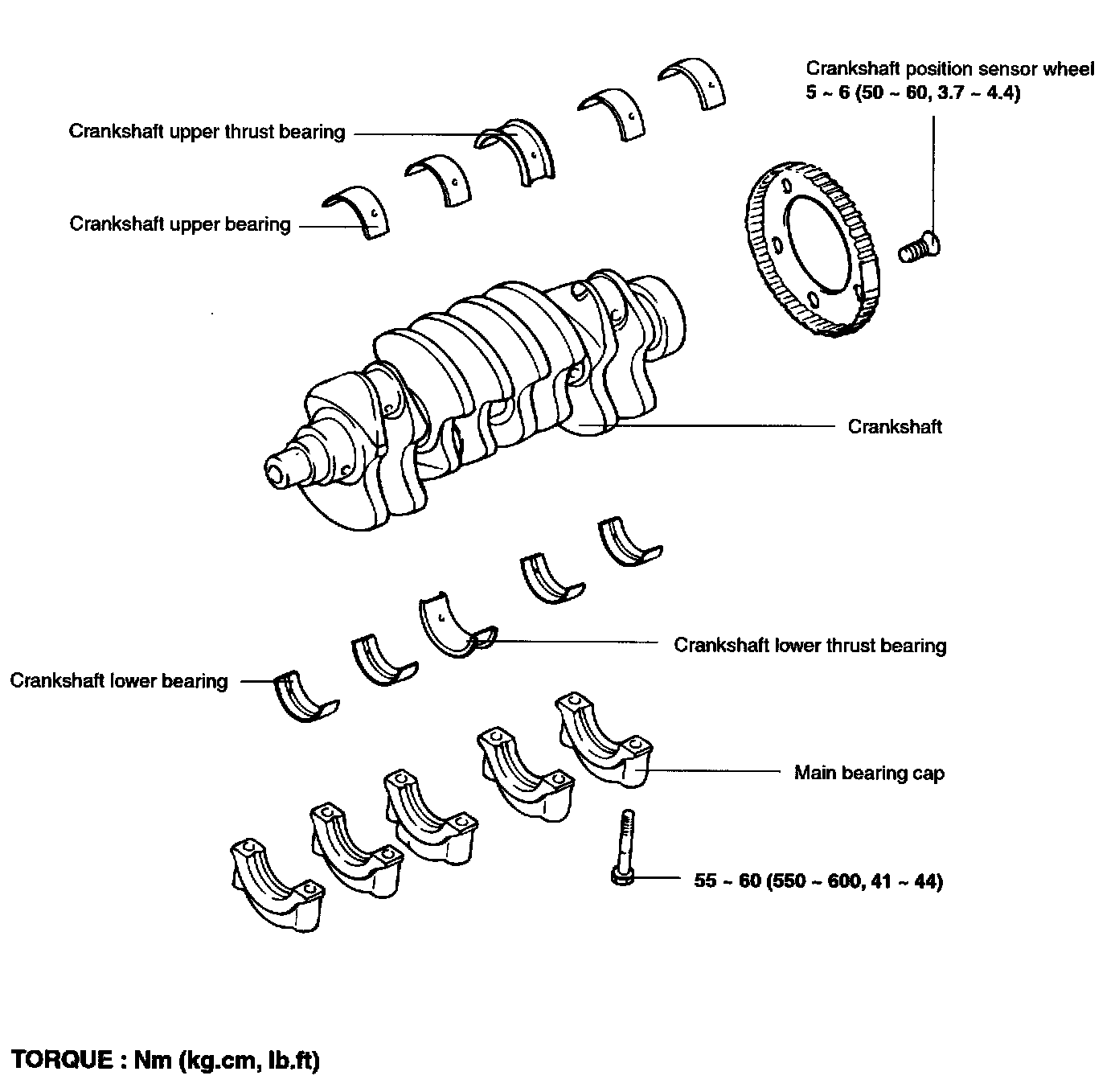 Crankshaft bearing cap bolt 55 - 60 Nm (550 - 600 kg-cm, 41 - 44 ft. lbs.)
