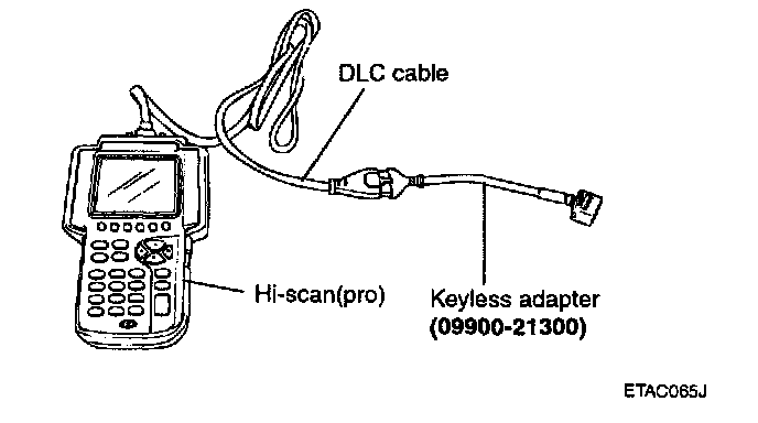 USING HI-SCAN (PRO)1. To register transmitter code, first connect keyless adapter (09900-21300) to DLC(Data Link Connector) cable of hi-scan as shown in the illustration.