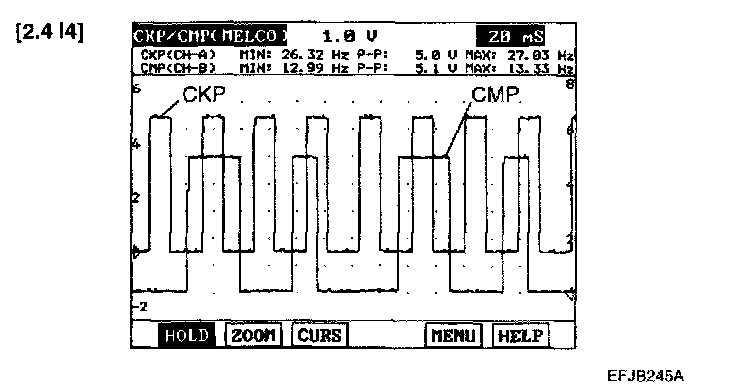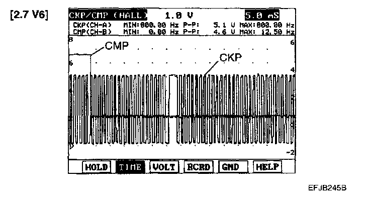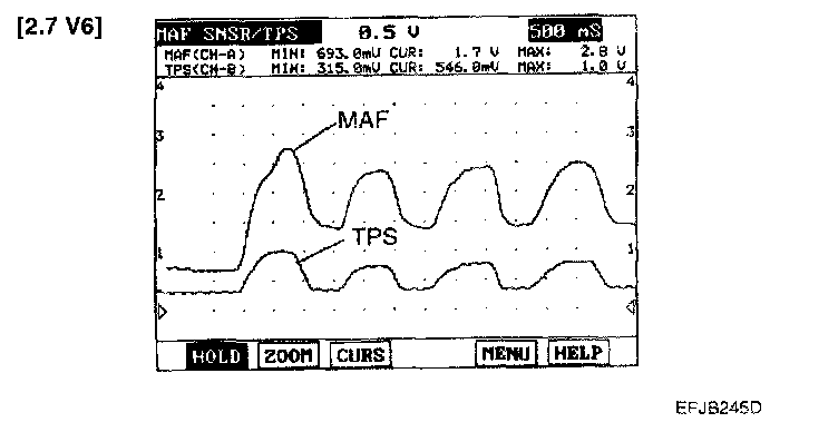 MAJOR SENSOR REFERENCE WAVE-FORMSThe following are the major sensor reference wave-forms. Below is the data for CMP, Mass Air Flow Sensor, Throttle Position Sensor, Rear O2 Sensor, Front O2 Sensor and Injection Pulse when rewing quickly up to 4800 rpm under no load after warming up engine sufficiently. Each value is for reference, the exact values may vary.