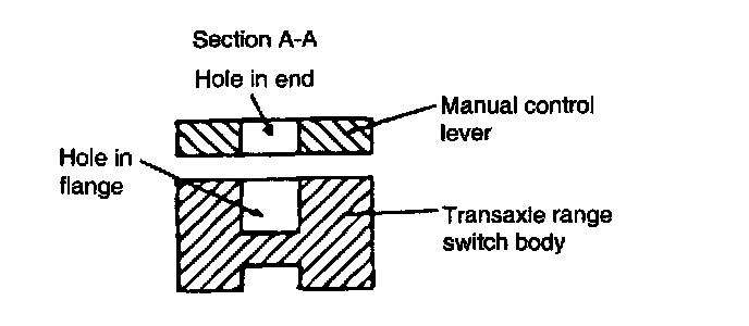 4. Loosen the transaxle range switch body mounting bolts and then turn the transaxle range switch body so the hole in the end of the manual control lever and the hole (cross section A-A in the figure) in the flange of the transaxle range switch body flange are aligned.