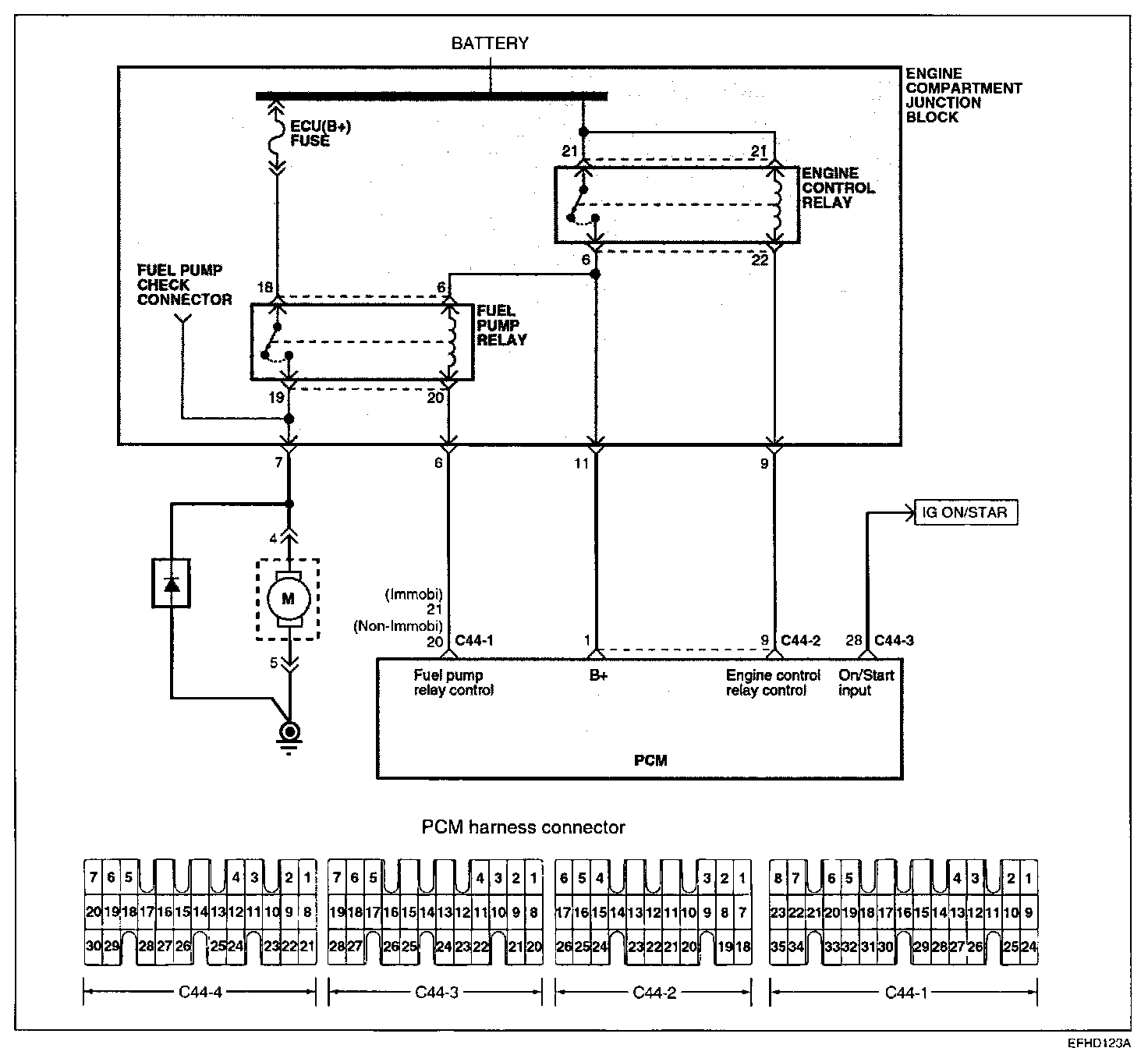 ENGINE CONTROL MODULE (ECM) CONTROL RELAYWhen the ignition switch is turned on, battery voltage is applied from the ignition switch to the PCM, turning ON the ignition power transistor and energizing the MFI control relay coil. This turns ON the MFI control relay switch, and supplies power from the battery to the PCM through the MFI control relay switch.