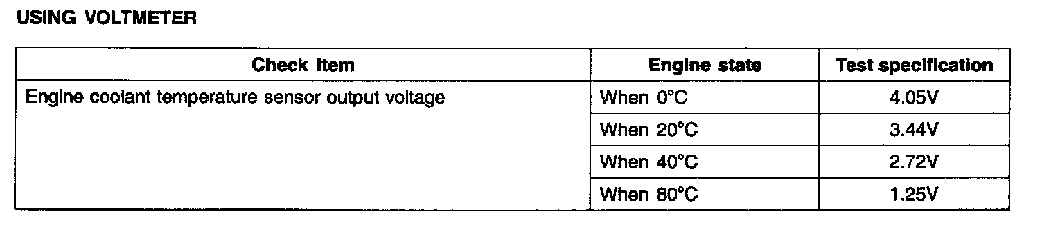 The engine coolant temperature sensor, located in the engine coolant passage of the cylinder head. It detects the engine coolant temperature and relays signals to the ECM. It employs a thermistor which is sensitive to changes in temperature. The electric resistance of a thermistor decreases in response to temperature rise. The ECM judges engine coolant temperature by the sensor output voltage and provides optimum fuel enrichment when the engine is cold.