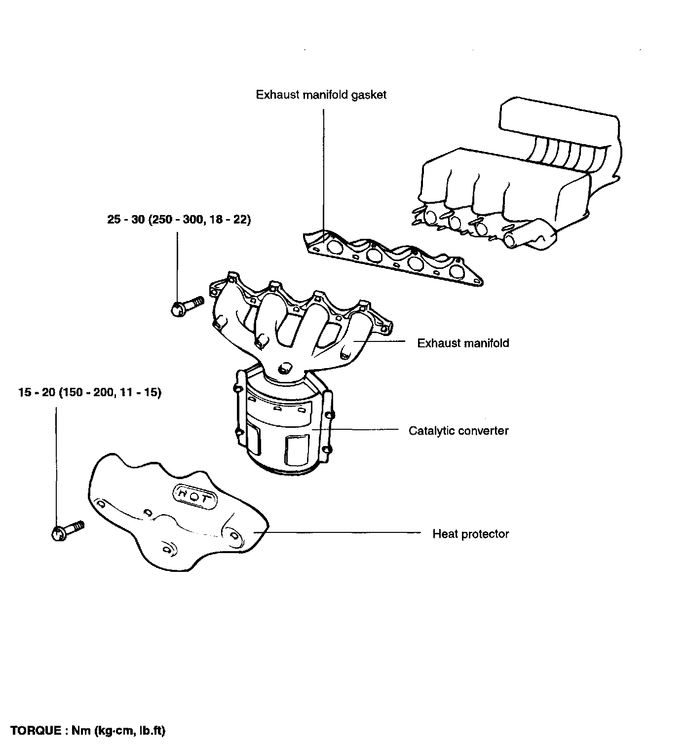 Exhaust manifold cover to exhaust manifold bolts 15-20 Nm (150-200 kg-cm, 11-14 ft. lbs.)