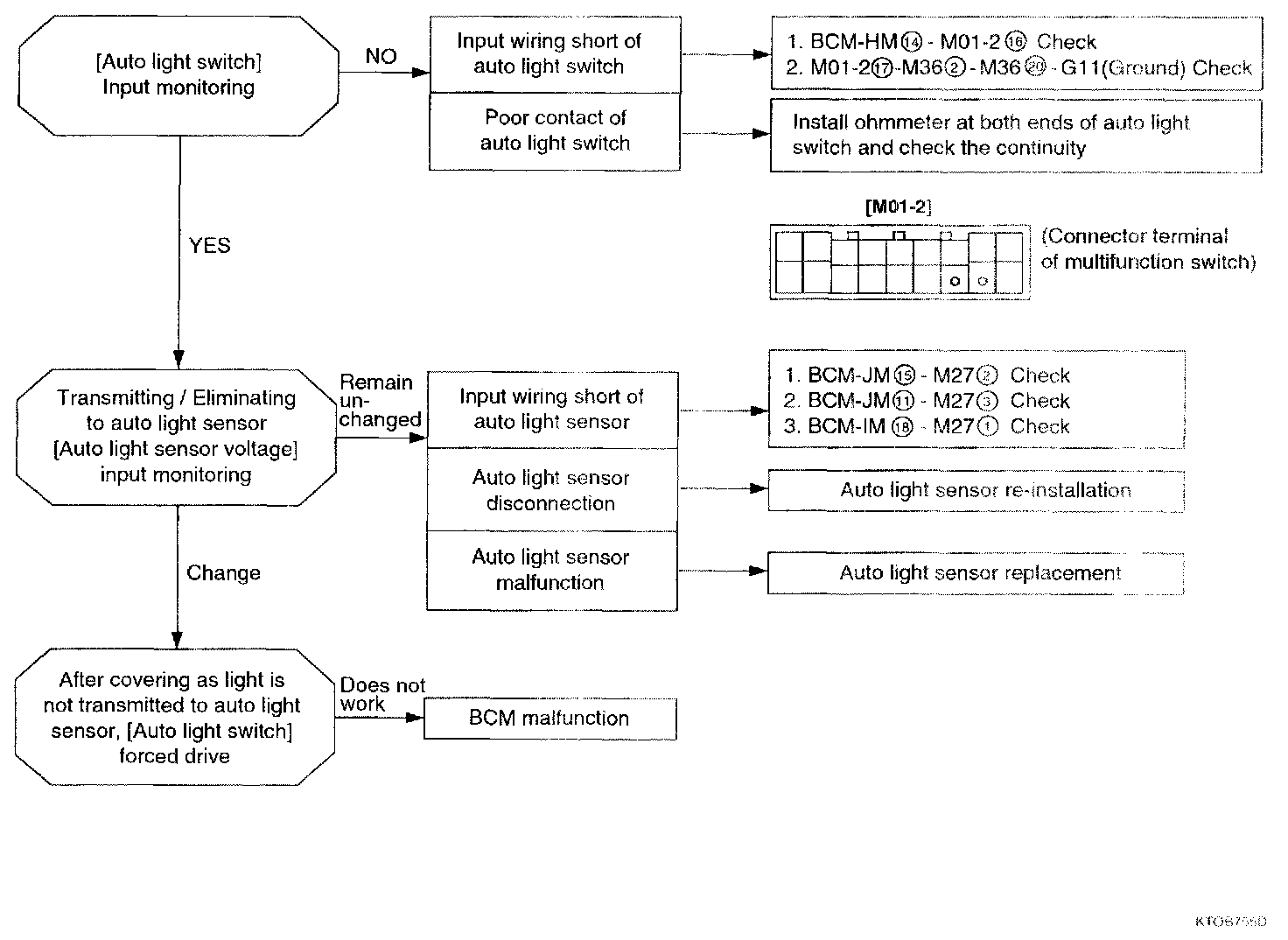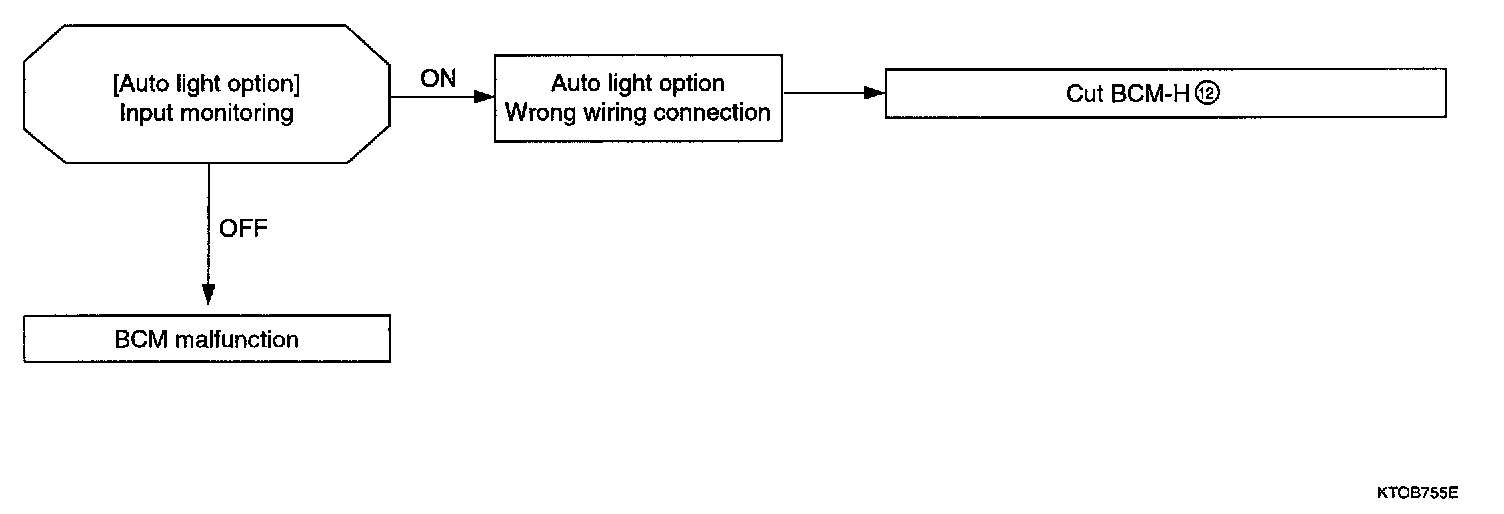 Check BCM input/output condition against auto light switch, auto light sensor voltage, auto light option, tail lamp and headlamp.