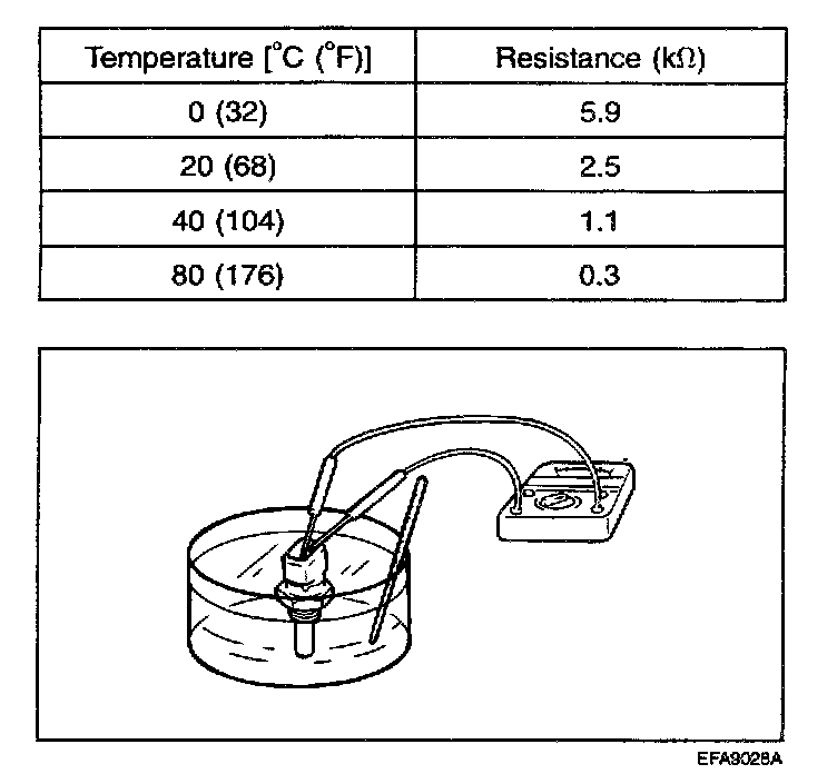 2. With temperature sensing portion of engine coolant temperature sensor immersed in hot engine coolant, check resistance.