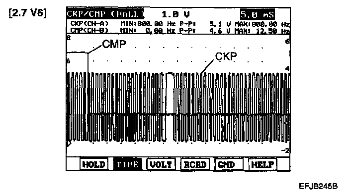 MAJOR SENSOR REFERENCE WAVE-FORMSThe following are the major sensor reference wave-forms. Below is the data for CMP, Mass Air Flow Sensor, Throttle Position Sensor, Rear O2 Sensor, Front O2 Sensor and Injection Pulse when rewing quickly up to 4800 rpm under no load after warming up engine sufficiently. Each value is for reference, the exact values may vary.