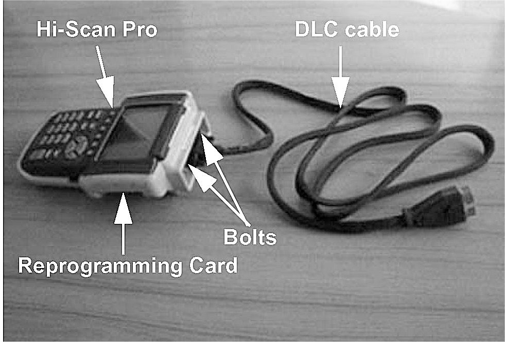 1. Attach the Data Link Connector (DLC) cable to the Hi-Scan Pro main body and tighten the 2 bolts securely.