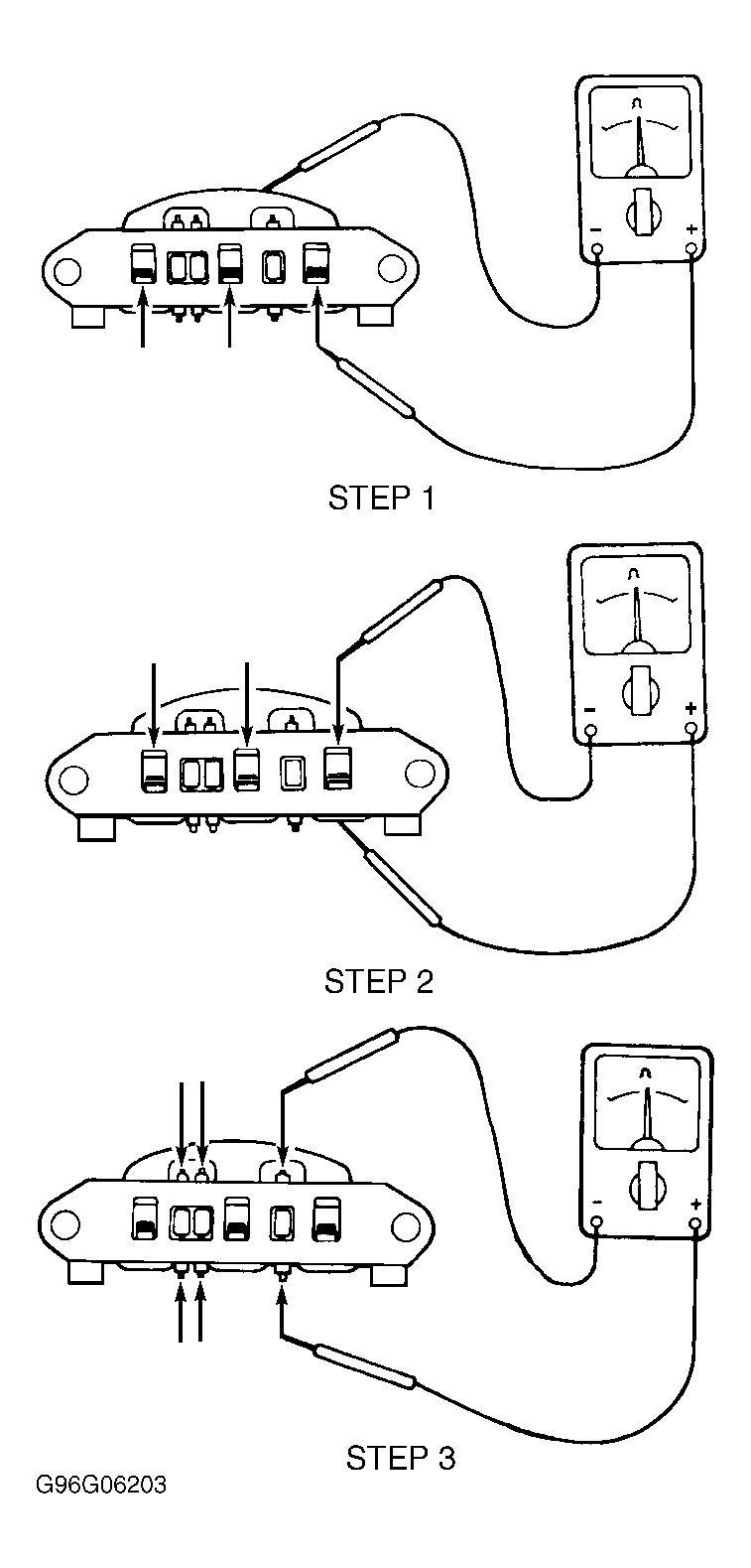 Using DVOM, check continuity of each diode, in both directions. See STEP 3 in illustration. See Fig 1 . Continuity should exist in only one direction. If continuity of any diode is not as specified, replace rectifier assembly.