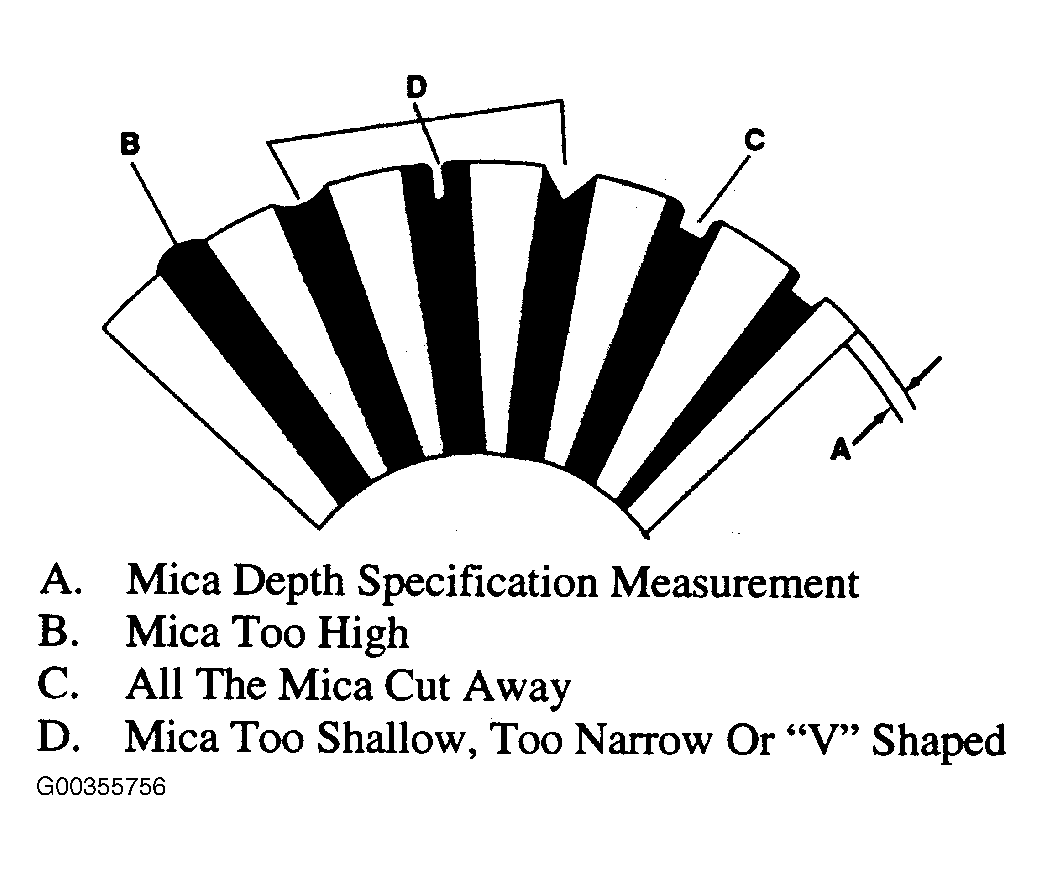 Check mica condition and measure mica depth between commutator segments. See Fig 1 . If mica is too high, undercut to proper depth with a hacksaw blade. For specification, see STARTER SPECIFICATIONS . Replace armature if insulator depth is not within specification. See OVERHAUL .
