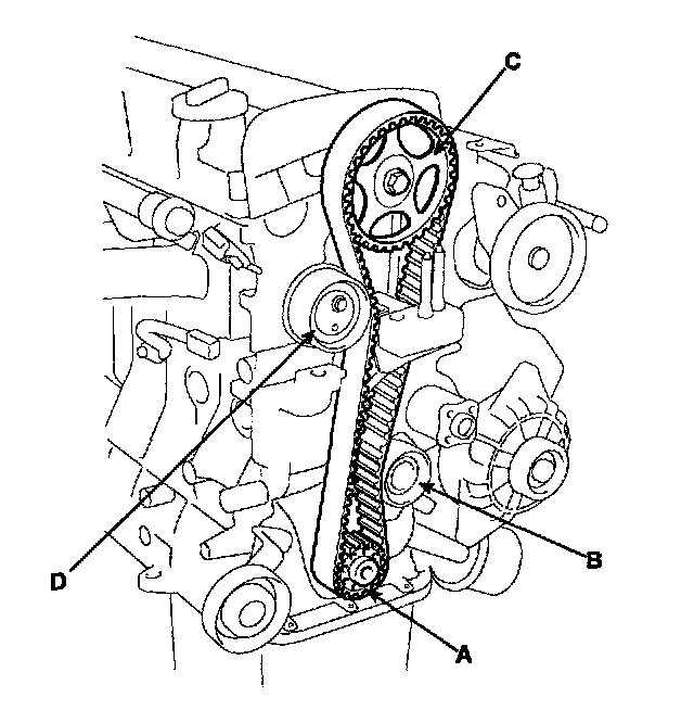 Belt so as not give slack at each center of shaft. Do as following procedures when installing timing belt. Crankshaft sprocket (A) -> Idler pulley (B) -> Camshaft sprocket (C) -> timing belt tensioner (D).