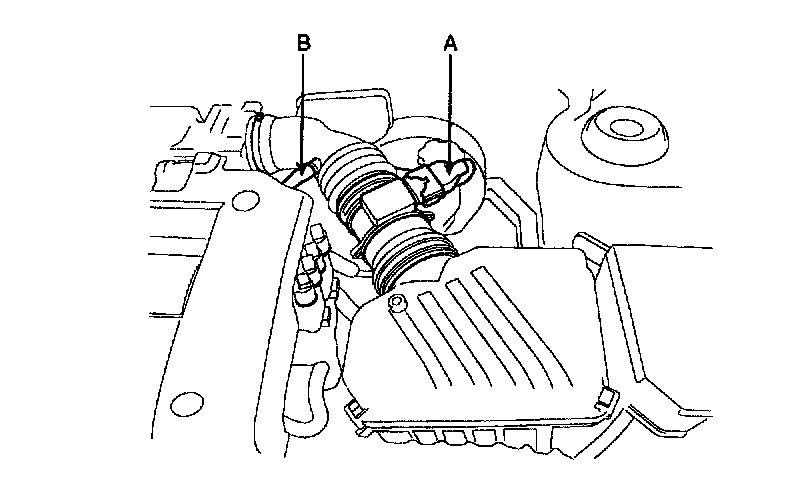 4. Disconnect the air flow sensor connector (A) and breather hose (B).