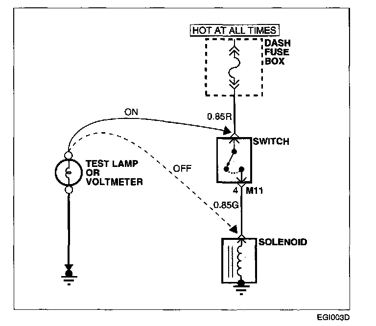 a. Connect one lead of a test lamp or voltmeter to a ground. If you are using a voltmeter, be sure it is the voltmeter's negative test lead you have connected to ground.