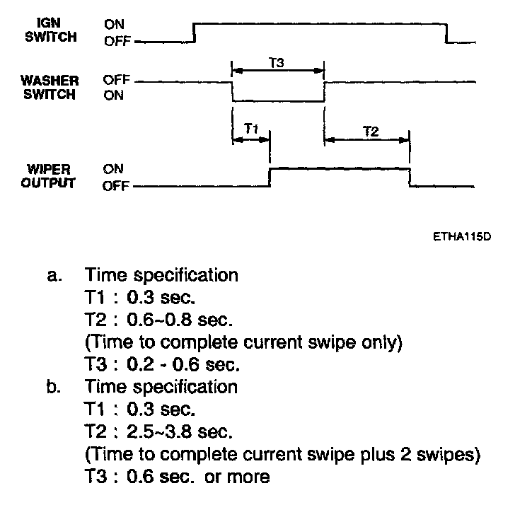 IG2 must be on for this function to operate. When the washer switch is on for more than 0.3 sec, the wiper output is activated immediately. The length of time the washer switch is held for is then evaluated to determine the number of swipes required.