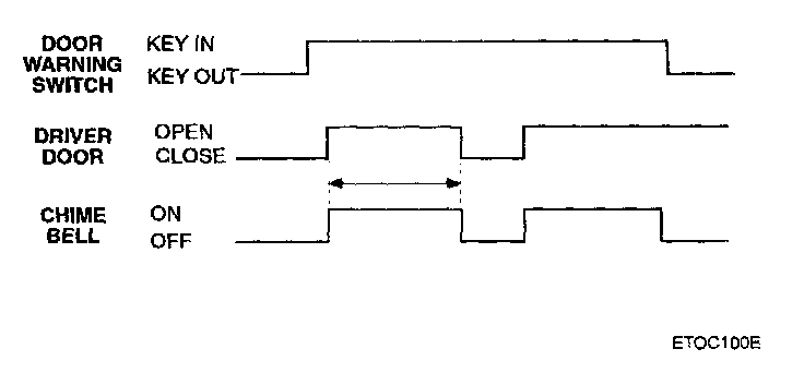 If the key is in ignition key cylinder and the drivers door is opened, the chime bell sounds. This tone is the same as the seatbelt warning chime and over speed warning chime. The chime sound is generated with an 800 Hz drive, amplitude modulated with an exponentially decaying envelope of time constant 1 ± 0.25 seconds. If the door is closed or the key is removed, the chime stops immediately.