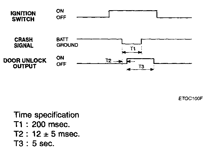 If IG1 is on and a crash signal is received, send an unlock pulse to the door locks. Unlock signal must occur within 12 ± 5 m sec after crash signal is received. Unlock pulse is 5 sec period. If crash unlock is not used in a particular variant then the crash input is to be left floating.