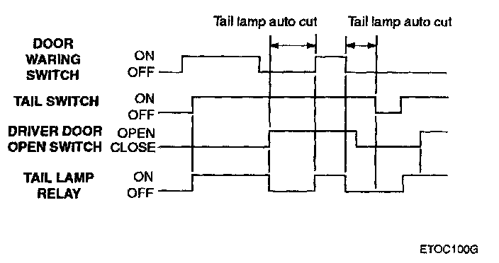 If tail lamps have been cut automatically, and then the tail lamp switch is turned off and on, then tail lamp is switched on and auto cut function is cancelled. If tail lamps have been cut automatically, and the ignition-key is inserted, then tail lamps are turned on.