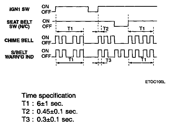 Whenever the ignition 1 is turned on the seat belt warning chime is sounded for total time 6 seconds, with period 0.9 sec and duty rate 50%. It is silenced immediately if the seat belt is sensed as fastened.