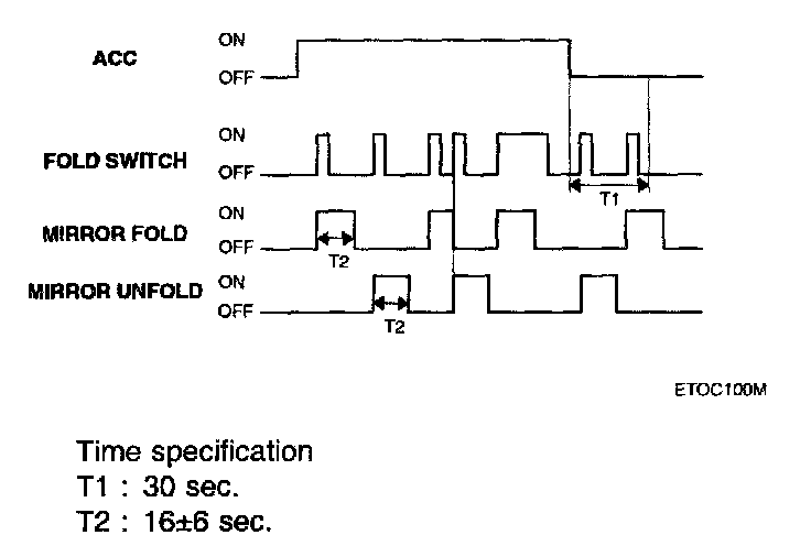If the folding mirror switch is pressed within 30 seconds after the ACC signal is removed, the mirror outputs (folding or unfolding) will operate for 16 ± 6 sec If during the mirror operation, the folding mirror switch is pressed again then the opposite operation will commence again. If after the ACC signal is removed, the folding mirror switch is repressed within the 16 ± 6 sec, the mirror outputs will operate for a further 16 ± 6sec