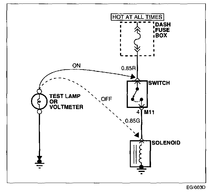 a. Connect one lead of a test lamp or voltmeter to a ground. If you are using a voltmeter, be sure it is the voltmeter's negative test lead you have connected to ground.