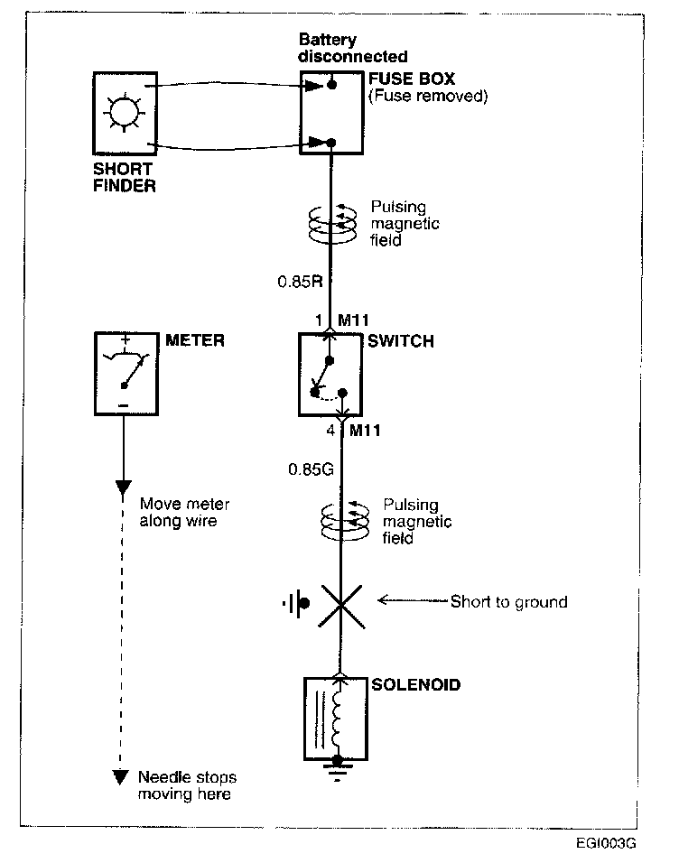 e. Beginning at the fuse box, slowly move the short finder along the circuit wiring. The meter will show current pulses through sheet metal and body trim. As long as the meter is between the fuse and the short, the needle will move with each current pulse. Once the meter is moved past the point of the short, the needle will stop moving. Check around this area to locate the cause of the short circuit.