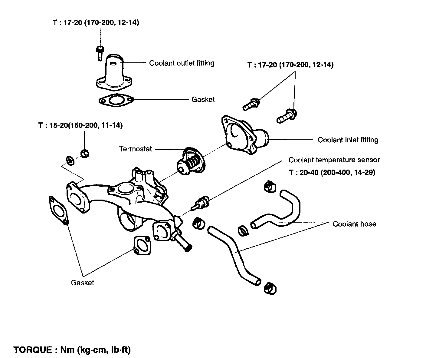 Engine coolant inlet fitting attaching bolt 17 - 20 Nm (12 - 14 ft. lbs.)