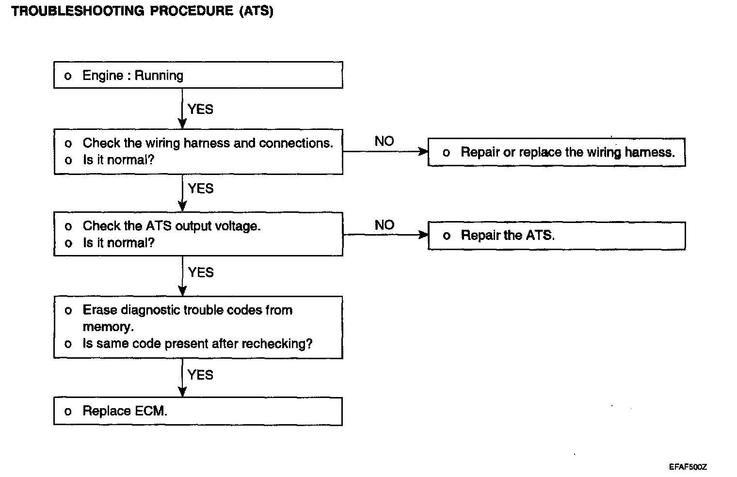 2. If the MAF sensor output voltage is other than 0 when the ignition switch is turned on (do not start the engine), check for a faulty MAF sensor or ECM.