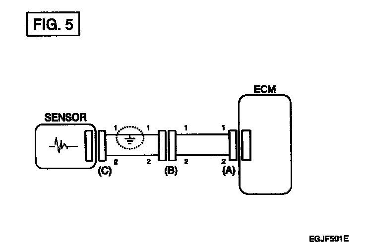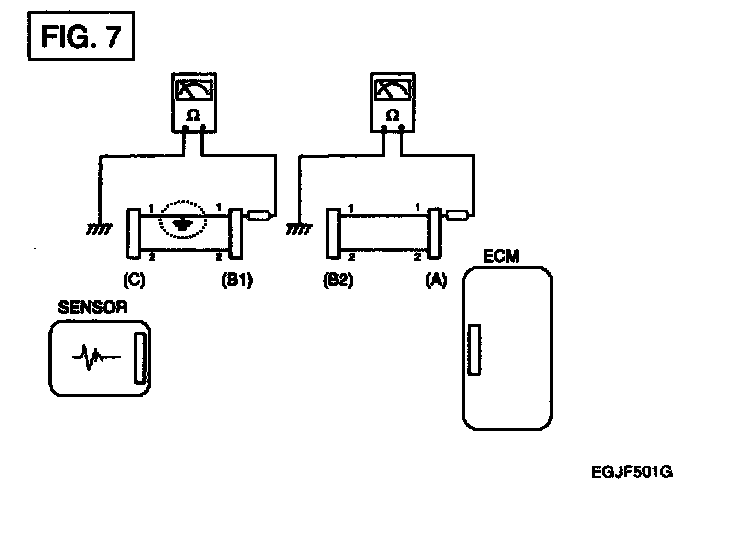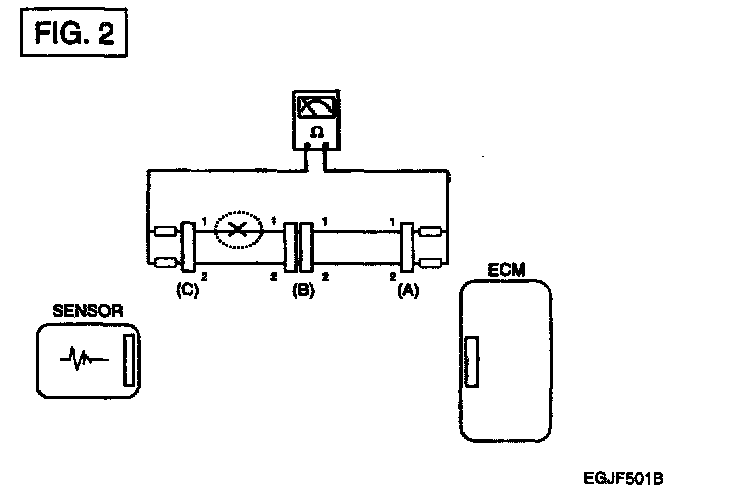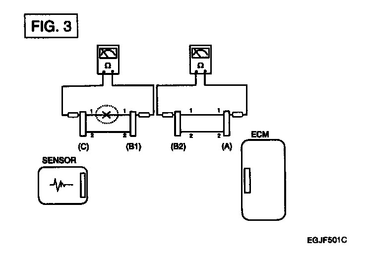 b. Disconnect connector (B), and measure for resistance between connector (C) and (B1) and between (B2) and (A) as shown in [FIG. 3).