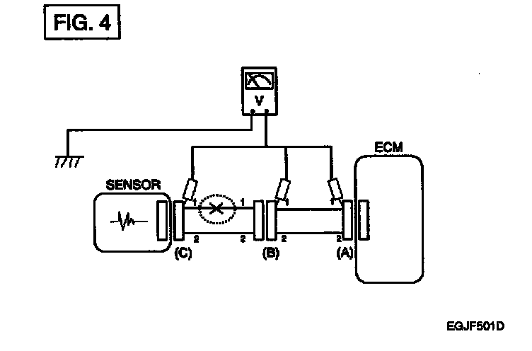a. With each connector still connected, measure the voltage between the chassis ground and terminal 1 of each connectors (A), (B) and (C) as shown in [FIG. 4].