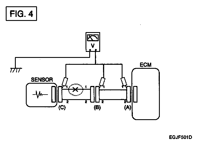 a. With each connector still connected, measure the voltage between the chassis ground and terminal 1 of each connectors (A), (B) and (C) as shown in [FIG. 4].