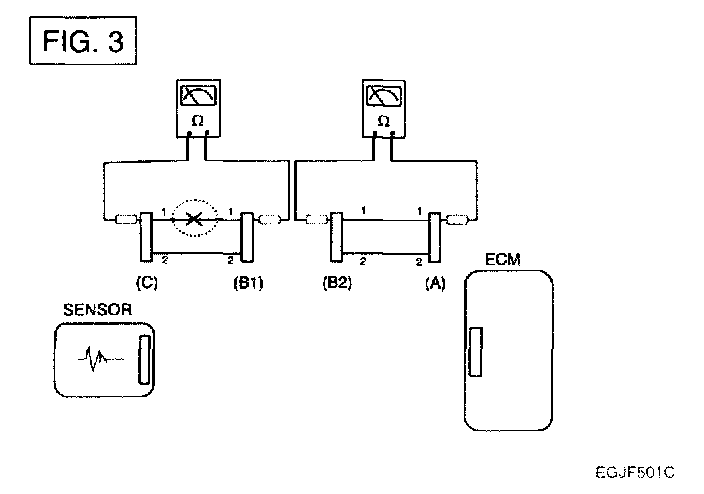 b. Disconnect connector (B), and measure for resistance between connector (C) and (B1) and between (B2) and (A) as shown in [FIG. 3].