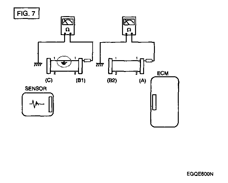 b. Disconnect connector (B), and measure the resistance between connector (A) and chassis ground, and between (B1) and chassis ground as shown in [FIG.7].