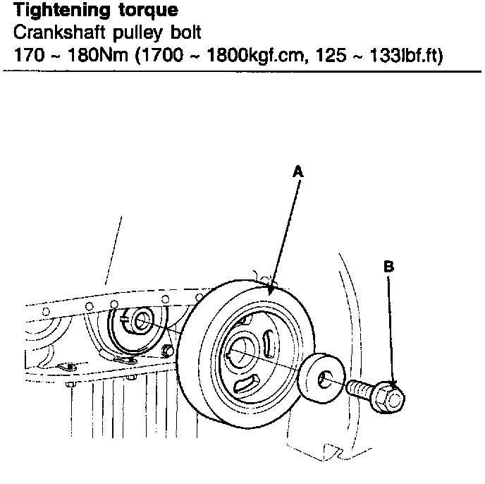 Install the flange and crankshaft pulley (A). Make sure that crankshaft sprocket pin fits the small hole in the pulley.