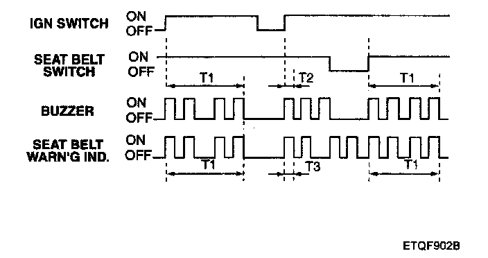 1. Since the ignition is switched ON, the seat belt warning indicator is illuminated (with period : 0.6 sec., duty rate : 50%) and the buzzer is sounded (with period : 0.9 sec., duty rate : 50%) for total time 6 seconds.