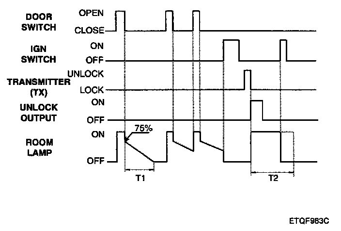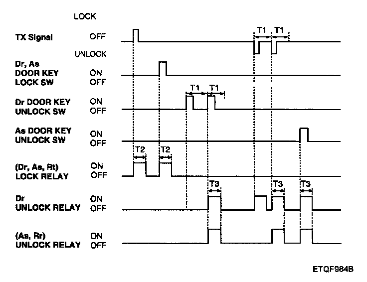 - When the driver's door key UNLOCK switch is ON during T1 after the transmitter's UNLOCK signal is detected, the 4 door UNLOCK relay is ON for T3.