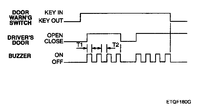 1. If the key is in the ignition key cylinder and the driver's door is opened, the buzzer sounds continually (period:0.9 sec. Duty rate:50%).