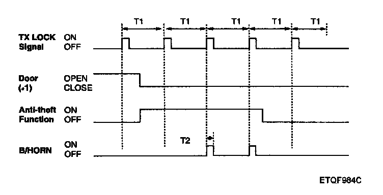 2. The burglar alarm horn does not operate when cancelling the anti-theft function during T1.